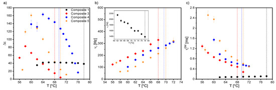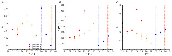 Temperature dependence of the dielectric increment, Δε; the relaxation frequency, νr; and the distribution parameter of the relaxation time, α, obtained by fitting the Cole–Cole model [51] to the registered dielectric spectra in the TGBA*/SmA* phases are presented in Figure 8. The α parameter for SM was mostly in the range of 0.1–0.2, and only for Composite 3 was above 0.5 (Figure 7c). The small dielectric increment and strongly temperature-dependent relaxation frequency were characteristic of the soft mode, and was reported in the literature, e.g., for ferroelectric liquid crystal 10.OPOSMH [52].