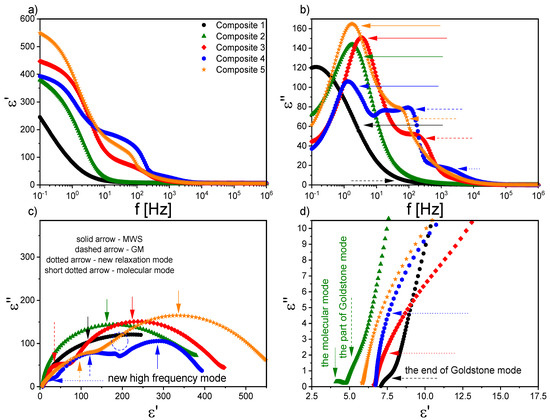 Dielectric spectra of Composites 1–5 in the ferroelectric SmC* phase (60 °C): dispersion (a); absorption (b); Cole–Cole plot (c); enlarged high-frequency part of Cole–Cole plot (d). Continuous colored arrows indicate the MWS process, dashed—the GM, dotted—a new relaxation process, and short-dotted—a molecular process. The legend in graph (a) is the same for all graphs. The dashed blue circle in graph (c) indicates an additional relaxation process present between the MWS and the Goldstone processes for Composite 4.
