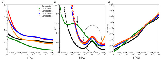 Dielectric dispersion (a) and absorption (b), as well as real component of the specific electric conductivity (c) for Composites 1–5 in the crystal phase (30 °C). The vertical arrow in (b) indicates the additional process registered for Composite 2. The legend in graph (a) is the same for all graphs. The dashed ellipse in (b) surrounds the high-frequency process present for all nanocomposites in the crystal phase.