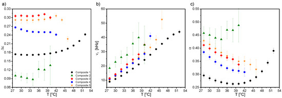 Temperature dependences of the dielectric increment, Δε (a); relaxation frequency, νr (b); and distribution parameter of relaxation time, α (c) of the relaxation process registered in the crystal phase. Due to the overlapping of two processes for Composite 2, the parameters were subject to large uncertainties. The legend in graph (a) is the same for all graphs.