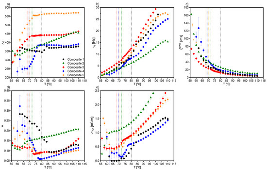 Temperature dependencies of the dielectric increment, Δε (a); relaxation frequency, νr (b); relaxation time (c); the distribution parameter of relaxation time, α (d) of the Maxwell–Wagner–Sillars process; as well as DC conductivity (e) for Composites 1–5. The legend in graph (a) is the same for all graphs. The vertical dashed lines represent the SmA*–SmC* phase transition temperature (during cooling).