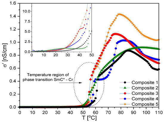 Another interesting issue from the application point of view was the specific electric conductivity, σ*. As is seen in Figure 14, the real part of σ* (σ* = σ’ − iσ” [74]) for nanocomposites was higher than for the pure matrix. It should also be kept in mind that the conductivity could also be affected by ionic impurities adsorbed on nanoparticles and introduced into the matrix at the synthesis stage. At higher temperatures, they desorbed from the nanoparticles’ surfaces and become parasitic ions in the matrix [75]. It is very interesting that σ’ was much higher in mesophases than in the crystal phase, and the differences were enormous. For example, for Composite 5, the difference in σ’ between the crystal and liquid crystalline phases was around 1500 pS/cm. Within mesophases, the highest specific electric conductivity was for Composite 5, as was expected for the nanocomposite with the highest amount of γ-Fe2O3 nanoparticles. Kumar et al. also observed an increase in conductivity after doping the ferroelectric liquid crystals 5F6T and 6F6T with TiO2 nanoparticles (ca. 18–23 nm, 0.1 and 1.0 wt %) [76], as did Naser, after doping liquid crystal with Fe3O4 nanoparticles (up to 1 wt %) [77].