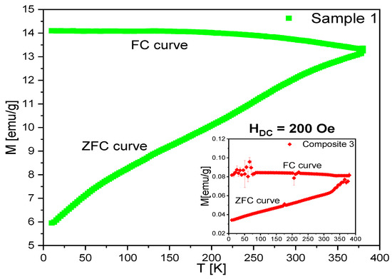 The magnetic properties of Samples 1–2 and Composites 2–6 were investigated by measuring the temperature dependence of magnetization in a DC magnetic field of 200 Oe (ZFC and FC curves; the external magnetic field dependence of magnetization and the magnetic hysteresis (at 10, 100, 200, and 300 K)). As an example, ZFC and FC curves for Sample 1 and Composite 3 are presented in Figure 15. The fluctuations visible in the FC curve for the Composite 3 were probably caused by an excessive temperature rate. Both the ZFC and FC curves for Sample 1 were similar to those of Composite 3 and other nanocomposites, respectively. As is seen, the FC curve reached saturation in a low-temperature range for both samples, which was previously observed for smaller γ-Fe2O3 nanoparticles [79] and was associated with dipolar interactions. Moreover, the convergence of the ZFC and FC curves was not visible up to 380 K; therefore, both Sample 1 and the nanocomposites were in the blocked state (TB corresponded to the convergence point of both the ZFC and FC curves). It seemed that TB was outside of the measuring range, because we did not use any surfactant to decorate the γ-Fe2O3 nanoparticles, in opposition to Kataby et al., who observed significant TB modifications depending on the surfactant used (e.g., stearic acid shifted TB to 280 K in relation to sulfonic acids, where TB was around 120 K) [79], as well as Tanwar et al., who showed that decoration of nanoparticles with oleic acid changed TB (from 95 K up to 15 K in the 0.5 T magnetic field) [80]. It should also be noted that in the case of surfactant-functionalized nanoparticles, the TB depends on the strength of the magnetic field. Moreover, the TB for the same type of nanoparticles may differ depending on the size of the nanoparticles, their decoration or not with a surfactant, as well as possible impurities. Wu et al. showed that the TB for γ-Fe2O3 short nanotubes very strongly depended on the DC magnetic field used to register the ZFC/FC curves (TB decreased from 275 K to 40 K when the applied magnetic field changed from 500 Oe to 5000 Oe) [81]. Summarizing the above, apart from the modification of the phase transition temperatures and the degradation of mesophases [39], this was another reason not to use any surfactant in the preparation of composites.