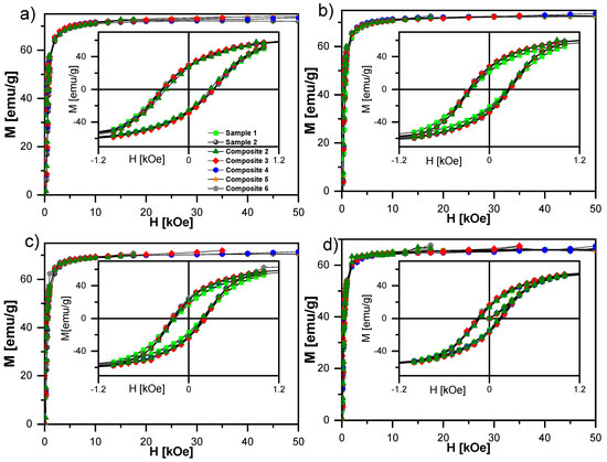 Magnetization vs. external magnetic field and magnetic hysteresis (insets) for Samples 1–2 and Composites 2–6 measured at 10 K (a), 100 K (b), 200 K (c), and 300 K (d). All values were scaled to values for the γ-Fe2O3 nanoparticles (Sample 1). The solid lines in all figures are a guide for the eye. The legend in graph (a) is the same for all graphs.