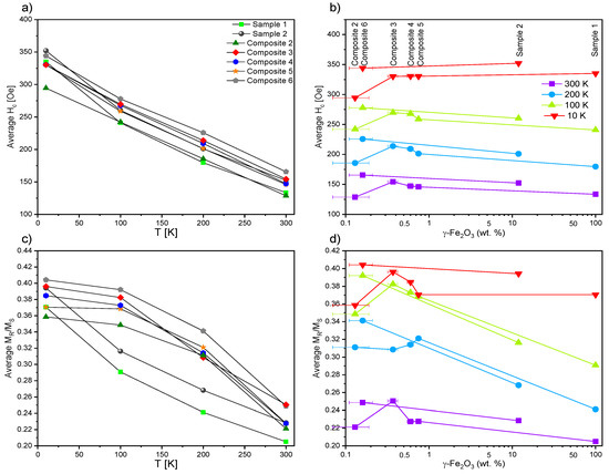Temperature (a) and estimated weight percent (wt %) of the γ-Fe2O3 nanoparticles (b) dependencies of the average coercive field, and temperature (c) and estimated γ-Fe2O3 wt % (d) dependencies of the average remanence ratio (remanent magnetization MR/saturation magnetization MS) for Samples 1–2 and Composites 2–6. The solid lines in all figures are a guide for the eye. The legend in graph (a) is the same for graph (c), while the legend in graph (b) is the same for graph (d).