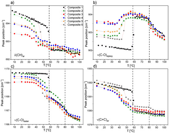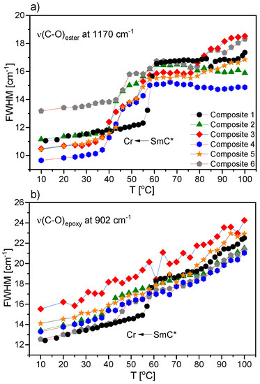 Figure 12 presents temperature dependencies of the Δε, νr, and α parameters of the high-frequency relaxation process observed in the crystal phase for all nanocomposites (in the case of Composite 2, the double Cole–Cole function was fitted). As is seen, this relaxation process was visible at cooling just from the SmC*–Cr phase transition for Composite 1, while it appeared a few degrees below this transition for Composites 2–5. Its dielectric parameters (Δε, νr, and α) increased after doping the LC matrix with γ-Fe2O3 nanoparticles, except for Composite 2 (due to the overlapping of the low- and high-frequency processes, they were subjected to large uncertainties). The strong modifications of the α parameter were due to the distortion of the long-range order in the crystal phase.