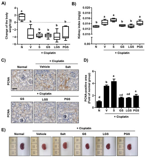 Effect of GABA on body weight loss and renal hypertrophy following high salt intake in cisplatin-induced acute nephrotoxicity. (A) Change of body weight. (B) Kidney/body weight ratio. Data are expressed as means ± SD (n = 8). a,b Bars with different letters are significantly different at p < 0.05 by Tukey test. (C) Intra-renal expression of proliferating cell nuclear antigen (PCNA). Scale bar = 100 μm. (D) Quantitative analysis for the positive area of PCNA. Data are expressed as means ± SD (n = 4). a–d Bars with different letters are significantly different at p < 0.05 by Tukey test. (E) Representative kidney images. N, normal group; V, cisplatin + saline group; S, cisplatin + 4% high salt group; GS, cisplatin + high salt containing gamma aminobutyric acid (GABA) group; LGS, cisplatin + 4% sodium containing lacto GABA salt group; PGS, cisplatin + 4% sodium containing postbiotics GABA salt group.