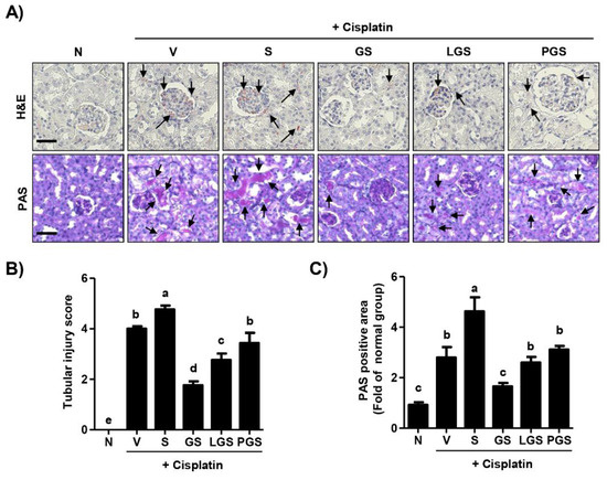 Effect of GABA on renal histological changes following a high salt intake in cisplatin-induced acute nephrotoxicity. (A, top) Representative images of H&E-stained sections in the kidney. Black arrows indicate histological changes including mononuclear cell infiltration, tubular dilation, and hemorrhage. Scale bar = 100 μm. (A, bottom) Representative images of periodic acid Schiff (PAS)-stained sections in the kidney. Black arrows indicate glycogen accumulation in injury renal tubules that stained with a strong pink color. Scale bar = 100 μm. (B) Tubular injury score evaluated on H&E-stained kidney sections. (C) Quantitative analysis for PAS-positive area. (B,C) Data are expressed as means ± SD (n = 3). a–e Bars with different letters are significantly different at p < 0.05 by Tukey test. N, normal group; V, cisplatin + saline group; S, cisplatin+ 4% high salt group; GS, cisplatin + high salt containing GABA group; LGS, cisplatin + 4% sodium containing lacto GABA salt group; PGS, cisplatin + 4% sodium containing postbiotics GABA salt group.