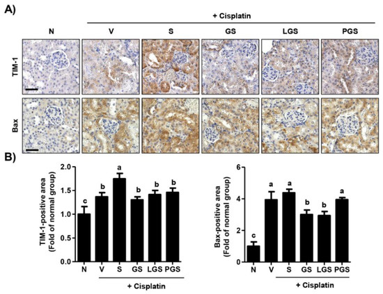 Effect of GABA salt on renal cell death in cisplatin-induced acute nephrotoxicity. (A) Intra-renal expression of T-cell immunoglobulin and mucin domain 1 (TIM-1) and Bcl2- associated X (Bax). Scale bar = 100 μm. (B) Quantitative analysis for positive area of TIM-1 and Bax. Data are expressed as means ± SD (n = 4). a–c Bars with different letters are significantly different at p < 0.05 by Tukey test. N, normal group; V, cisplatin + saline group; S, cisplatin+ 4% high salt group; GS, cisplatin + high salt containing GABA group; LGS, cisplatin + 4% sodium containing lacto GABA salt group; PGS, cisplatin + 4% sodium containing postbiotics GABA salt group.