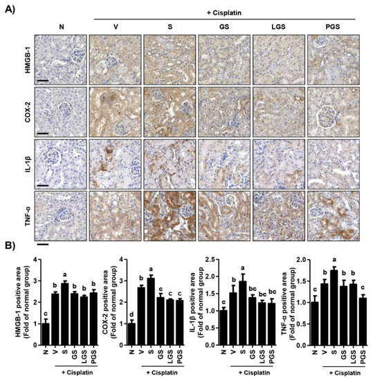 Effect of GABA salt on renal inflammation in cisplatin-induced acute nephrotoxicity. (A) Intra-renal expression levels of high mobility group box-1 (HMGB-1), cyclooxygenase-2 (COX-2), interleukin-1β (IL-1β), and tumor necrosis factor-α (TNF-α). Scale bar = 100 μm. (B) Quantitative analysis for the positive area of HMGB-1, COX-2, IL-1β and TNF-α. Data are expressed as means ± SD (n = 4). a–d Bars with different letters are significantly different at p < 0.05 by Tukey test. N, normal group; V, cisplatin + saline group; S, cisplatin+ 4% high salt group; GS, cisplatin + high salt containing GABA group; LGS, cisplatin + 4% sodium containing lacto GABA salt group; PGS, cisplatin + 4% sodium containing postbiotics GABA salt group.