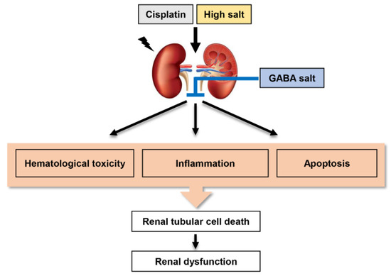 GABA has a protective ability against the negative effect of high salt intake in cisplatin-induced renal toxicity. Its mechanism involves the suppression of hematological and biochemical toxicity, apoptosis, and inflammation (Figure 5). Although further studies are needed to confirm the renal protective effect of GABA in the renal cells and the clinical trials, our present findings suggest that GABA-enriched salt has a beneficial effect against immoderate high salt intake-mediated kidney injury in patients with cisplatin-induced nephrotoxicity. Among them, GABA salt has the best protective effect against cisplatin-induced histological changes in renal tissues. The protective effect of GABA salt on renal injury is different depending on the sterilization and filtration process after fermentation with L. brevis BJ20 and L. plantarum BJ21. Further studies are needed to identify its action mechanism depending on the process.