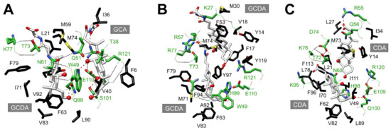 Stabilizing H-bond and hydrophobic interactions in the binding pocket of (A) human ileal (PDB: 2mm3 [25]), (B) chicken ileal (PDB: 2lba [51]), and (C) chicken liver (PDB: 2jn3 [40]) BABPs. Backbone and side chain atoms of residues with a polar side chain (green) are shown as lines and sticks, respectively. Hydrophobic amino acid side chains interacting with the apolar face of the bound bile salts are shown in black. Intermolecular (red) and intramolecular (black) H-bonds are indicated by dotted lines. Steroid ring OH-groups of bound bile salts are shown as red balls. Color coding: C-atoms in green (protein, polar residues), black (protein, apolar residues), or white (bile salts), O-atoms in red, N atoms in blue, S-atoms in yellow.