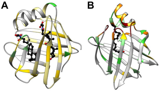 - Lücke, C.; Fushman, D.; Ludwig, C.; Hamilton, J.A.; Sacchettini, J.C.; Rüterjans, H. A comparative study of the backbone dynamics of two closely related lipid binding proteins: Bovine heart fatty acid binding protein and porcine ileal lipid binding protein. Mol. Cell. Biochem. 1999, 192, 109–121. [Google Scholar] [CrossRef]