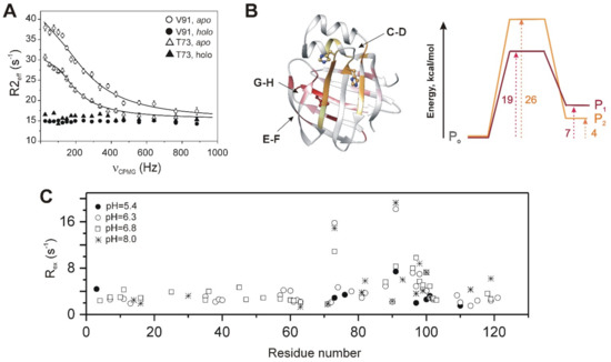 Slight perturbations in fast dynamics induced by ligand binding in BABPs are accompanied by major changes in slow motions. In the apo state of both ileal and liver BABP proteins, CPMG-based NMR spin relaxation analysis directed at the investigation of slow dynamics [80] reports an extensive network of conformational fluctuations on the fast end of ms time scale, which ceases upon bile salt binding [56,62,81]. Relaxation dispersion (Rex) profiles of individual residues in hI-BABP fit well to a global two-state exchange process between a major ground and a low populated (~1–5%) higher energy state (Figure 6A) [62,77]. Importantly, the time scale of the observed conformational fluctuation in the apo state matches the time scale of a rate-limiting conformational change preceding ligand binding in BABPs and FABPs inferred from stopped-flow kinetic measurements [44,82]. In both chicken and human BABP analogues, the most intense slow internal fluctuations are observed in the C-terminal face of the β-barrel, primarily in the EFGH-region, which in hI-BABP extends toward β-strands I and J as well (Figure 6B). Additionally, in hI-BABP, there is a second group of residues undergoing motion with a slightly slower exchange rate. The slower cluster is confined mainly to the N-terminal half of the protein involving α-I, βB with the preceding linker to α-II, and the C/D-turn region continuing in βD. Temperature-dependent NMR relaxation measurements show an entropy–enthalpy compensation for both clusters characteristic of disorder–order transitions [77] with energy barrier between the exchanging states of ~20 kcal/mol (Figure 6B). Supporting the hypothesis of exchange between the ground and a less ordered higher energy state, a joint analysis of Rex measurements and NMR thermal melting data [83] indicates a structural and energetic connection between ms timescale conformational fluctuations at and below room temperature and thermal unfolding (60 °C) of hI-BABP. Consistent with the NMR data, MD simulations show evidence of correlated motions involving the helical cap, the E-F strands, and the bottom of the β-barrel. The NMR measurements further suggest that the higher energy state shows similarities with a more open, partially unfolded state exhibiting a native-like residual structure in the N-terminal half and more disordered segments in the EFGH region [83]. According to the analysis, the more open state has a high susceptibility to dimerization which, as indicated by MD simulations, is most likely due to the exposure of hydrophobic patches. The formation of transient aggregates as a consequence of conformational fluctuations has also been suggested for cL-BABP with a subset of residues in regions of high plasticity exhibiting a singular behavior upon urea unfolding [84]. The exposure of hydrophobic residues upon functionally related conformational fluctuations appears to be a general characteristic of iLBPs posing an aggregation risk in the absence of ligands. The balance between protein function, conformational plasticity, and aggregation vulnerability has been investigated in detail in CRABP-I [85,86], highlighting the role of protecting mechanisms, which despite the risk of aggregation, enables proteins to retain conformational flexibility to function while avoiding unacceptable aggregation propensity [87,88].