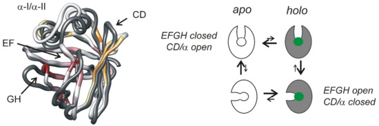 Because of their strong effect on entropy, motions on the picosecond to nanosecond time scale have high biological importance. Similar to other iLBPs, the apo state of BABPs displays an elevated level of fast internal mobility in specific segments such as the EF-region, the C/D-, and some other turn-regions (e.g., the F/G-turn in cL-BABP, the I/J-turn in hI-BABP) [56,62]. Regarding the helical region, while in cL-BABP α-II exhibits an increased degree of flexibility, in hI-BABP, it remains rigid on the ps-ns timescale. Overall, as indicated by order parameters of N-H bond vectors inferred from NMR relaxation analysis [74], BABPs are substantially more rigid on the ps-ns time scale than most FABPs [63,75,76] and even CR(A)BPs [61,64,69]. Additionally, in comparison with the two other subfamilies, bile salt binding is accompanied by only a modest stiffening of the protein backbone [56,62]. This is most noticeable when comparing ligand-induced changes in ps-ns flexibility in the helical cap and the proximate C/D- and E/F-turns (Figure 5). However, while the differences are numerically smaller, stiffening appears to be more extensive in hI-BABP, encompassing the most part of the N-terminal beta-sheet (in particular, βB, βC, βD) and a proximate segment of βJ, together with residues in the E/F-hairpin. Further studies of backbone dynamics in hI-BABP suggest different responses to temperature increase in the apo and the holo forms, indicating differences in local conformational heat capacities between the two ligation states [77].