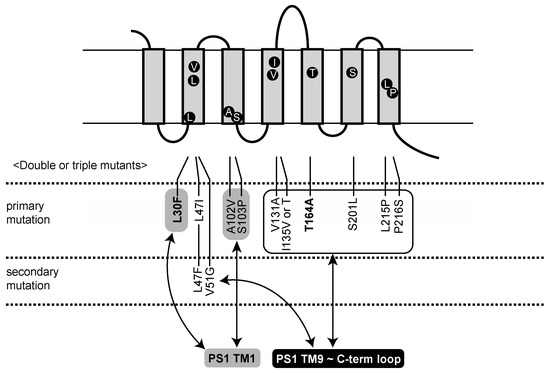 Aph1 mutants active in the absence of NCT map to transmembrane domains. Mutations in double or single mutants are indicated in the model with the seven transmembrane domains (TMDs) of Aph1. Mutations active as single mutants are shown as primary mutations; mutations active only in combination are shown as secondary mutations. The Aph1 mutations are in close proximity to PS1 TMD1 or TMD9 connected to the C-terminal loop, as indicated by arrows. L30F/T164A mutations, which activated γ-secretase, are shown in bold.