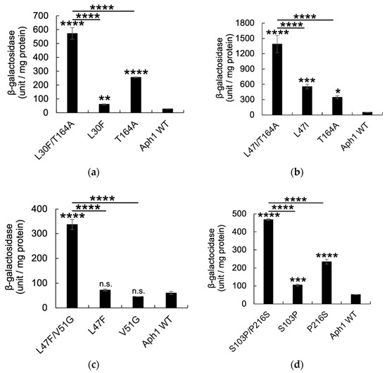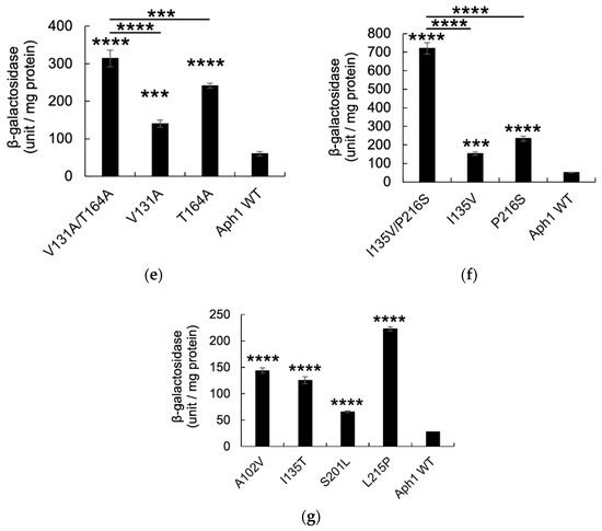 β-Galactosidase activity of Aph1 active mutants in the absence of NCT. Wild-type (WT) or mutant Aph1 was introduced into yeast with PS1, FLAG-Pen2, and APPC55-Gal4p; Gal4p cleaved from APPC55-Gal4p activates the reporter gene, lacZ, encoding β-galactosidase. β-Galactosidase activity was assayed in cells containing Aph1 double and single mutants (a–g). One unit of β-galactosidase activity corresponds to 1 nmol O-nitrophenol β-galactoside hydrolyzed per minute; it is expressed as units/mg lysate protein. Activity was normalized as relative to the activity of control cells without NCT (52.0 units/mg protein). Results from three independent assays are shown with their standard deviations. Statistical analyses were performed using one-way analysis of variance (ANOVA) followed by Dunnett’s multiple comparison test. Asterisks on each bar indicate p < 0.001 (****), p < 0.001 (***), p < 0.01 (**) or p < 0.05 (*) (a–g).