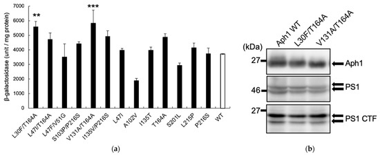 To assess the activities of these Aph1 mutations under physiological conditions in the presence of all γ-secretase subunits, we investigated the Aph1 mutants with wild-type PS1, NCT, and Pen2. The Aph1 mutants L30F/T164A and V131A/T164A showed 1.5-fold greater activity than did the WT (Figure 3a). Immunoblotting confirmed that the expression levels of mutant Aph1 and PS1 were similar to levels in the WT. These results suggest that γ-secretase with these two Aph1 mutations exhibit enhanced protease activity for APP.