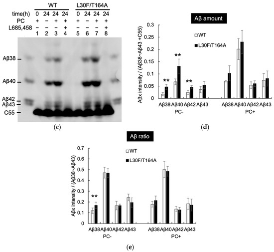 We analyzed Aβ-producing activity using the yeast microsomal fraction. The cleavage of APPC55 was tested in vitro by incubating the solubilized microsomes (Figure 4) [30]. Aβ was observed in the presence of γ-secretase with the wild-type Aph1 (Figure 4a, lanes 1–4). The amount of Aβ increased in the presence of PC, and diminished with L685,458, a γ-secretase-specific inhibitor. With the Aph1 L30F/T164A mutant, the intensities of the Aβ bands increased in different conditions (Figure 4a, lanes 6 and 7, and Figure 4b), indicating that the mutation enhances Aβ-producing activity. The intensities of different Aβ species, Aβ38, Aβ40, Aβ42, and Aβ43, also increased with L30F/T164A (Figure 4c, lanes 2, 3, 6, and 7, and Figure 4d); the ratio of each species was similar (Figure 4e), except that the ratio of Aβ38 was increased with the mutant. The ratio of long Aβ species (Aβ42 and Aβ43) with Aβ40 was similar. These results suggest that L30F/T164A enhances Aβ production but its Aβ trimming activity is similar to the WT.