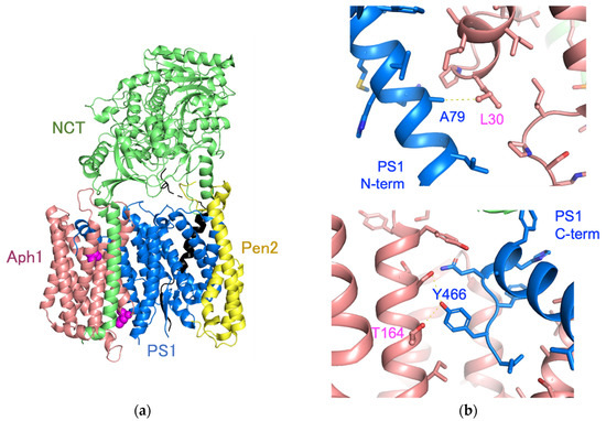 Aph1 mutations in the structure-based model. A structure-based model of the transmembrane core of human γ-secretase (Protein Data Bank code 5A63) is shown with a sphere containing the following residues: Leu30 and Thr164 (purple), PS1 (blue), Aph1aL (pink), NCT (yellow-green), Pen2 (yellow), and APP (black) (a). Leu30 and Thr164 of Aph1 are in close proximity to Ala79 and Tyr466 of PS1, respectively (b).