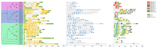 The phylogenetic tree, gene structure, KH domain location, and position of conservative motifs of 30 Arabidopsis thaliana KH family genes. From left to right were the unrooted phylogenetic tree, gene structure, position of KH domain and position of conservative motif. The axis below indicated the length of the CDS and protein.