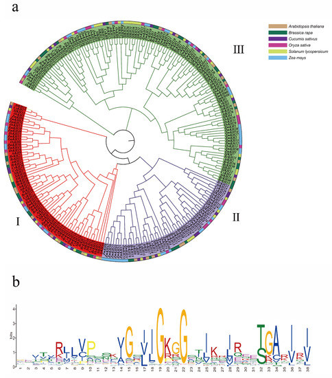 For a more detailed study of the KH domain, we analyzed the protein sequences of six species based on raw HMM of the KH domain downloaded from Pfam. As a result, 30 KH family genes in A. thaliana, 42 KH family genes in Brassica rapa, 28 KH family genes in Cucumis sativus, 34 KH family genes in Oryza sativa, 45 KH family genes in Solanum lycopersicum, 62 KH family genes in Zea mays were obtained, respectively (Table S2). All of these 241 genes were used to construct the phylogenetic tree of the KH family. As a result, all 241 KH family genes were divided into three subgroups (Figure 2a). Each subgroup contained all six species, revealing that all these KH family genes come from the same ancestor. A total of 233 of these 241 genes were found to contain similar motif sequences with a high proportion of G in 19th and 22nd positions in the KH motif sequence (GEVTVRJLVPSSKVGSIIGKGGSTIKRJREETGARIRI), which may be the conserved sequence motif in KH domain [27] (Figure 2b).