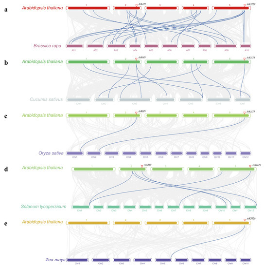 Synteny analysis of KH domain genes in Arabidopsis thaliana and other five species. The gray line represented all genes with synteny between the two species, and the synteny of KH domain genes was represented by the blue line. (a) Synteny between A. thaliana and Brassica rapa. (b) Synteny between A. thaliana and Cucumis sativus. (c) Synteny between A. thaliana and Oryza sativa. (d) Synteny between A. thaliana and Solanum lycopersicum. (e) Synteny between A. thaliana and Zea mays.
