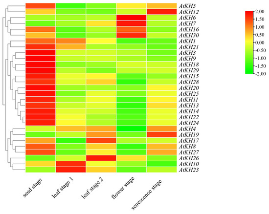 The RNA-seq data of the wild-type Col-0 was downloaded to detect the time-specific expression of the KH family genes in the growth and development of A. thaliana (Figure 4). AtKH6, AtKH8, AtKH16, and AtKH21 had similar patterns during growth and development, all of them have the highest expression in the flowing stage, suggesting that AtKH6/8/16/21 may be related to flower development regulation. Interestingly, we found that with the growth and development of plants, the expression level of AtKH12 will continue to increase and AtKH9 will continue to decrease though both of them were included in the same subgroup. In contrast, AtKH3 and AtKH9 showed the highest expression levels in the seed stage, decreased expression levels in the leaf stages (relatively consistent expression levels in the leaf stage 1 and leaf stage 2), and further decreased in the flower stage and senescence stage though they belonged to two different subgroups. In addition, the other 15 genes had the highest expression in the seed stage. All the results suggest that KH family genes may perform different functions in growth and development.