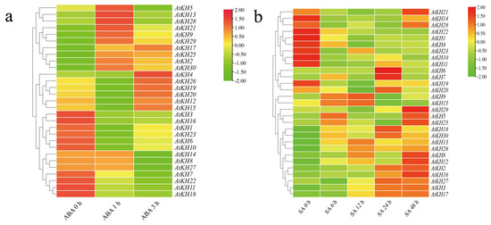 Expression data of A. thaliana was downloaded to analyze changes of expression under ABA and SA treatments. As shown in Figure 5a, the expression levels of AtKH2/5/9/13/17/21/25/28/29/30 after ABA treatment were increased at 1 h, among which the expression of AtKH2/17/25/29/30 kept stable at 3 h and the expression of AtKH5/9/13/21/28 decreased at 3 h. In contrast, the expression of AtKH4/12/15/19/20/26 decreased at 1 h and then increased at 3 h. Also, the expression of AtKH8/14/27 was insignificantly changed at 1 h and decreased at 3 h. Expression of other ten genes (AtKH1/3/6/7/10/11/16/18/22/23) was decreased after ABA treatment. Expression of KH family genes after SA treatment was complicated (Figure 5b). For example, the expression levels of AtKH1/4/10/11/14/21/22/23/28 were decreased after SA treatment at 6 h, 12 h, and 24 h, while expression of AtKH14/21/28 recovered the expression at 48 h. The expression of some genes (AtKH2/3/16/17/27) was generally increased after SA treatment. Other genes have the highest expression at a specific time point after SA treatment. These results suggested that KH family genes have different responses after ABA and SA treatments.