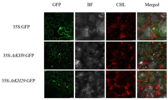 Subcellular location of AtKH9 and AtKH29 in Nicotiana benthamiana. GFP: Green fluorescent protein; BF: Bright-field images; CHL: Chloroplast fluorescence; Merge: Merged images.