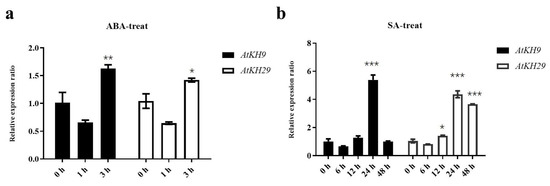 The expression levels of AtKH9/29. (a) AtKH9/29 expression levels at 0 h, 1 h, 3 h after ABA treatment. (b) AtKH9/29 expression levels 0 h, 6 h, 12 h, 24 h and 48 h after SA treatment. Error bars indicated SD. p value (* p < 0.05, ** p < 0.01, *** p < 0.001) was calculated using one-way analysis of variance and Tukey’s test for statistics.