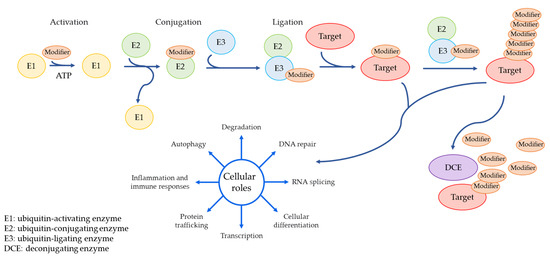 An enzymatic cascade of Ub and Ubls, and deconjugating enzymes. Ub and Ubls are conjugated to target substrates by an enzymatic cascade involving E1, E2, and E3. A modifier is first activated by an E1 activating enzyme and is transferred onto an E2 conjugating enzyme. Subsequently, E3 ligase interacts simultaneously with a modifier-loaded E2 and the target protein, and induces an isopeptide bond between the C-terminus of modifier and a lysine residue of the substrate. Once a modifier is conjugated to their targets, polypeptide chains are formed due to the presence of suitable motifs on modifiers. Deconjugating enzymes are responsible for the reverse process of the modification.