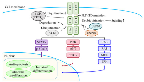c-Cbl is a member of the CBL family, which is a single-subunit RING E3 [52]. FLT3 is one of the receptor tyrosine kinases and is restrictedly expressed in the hematopoietic compartment [53]. c-Cbl is a Ub E3 ligase, which ubiquitinates and downregulates FLT3-ITD in AML [54]. Sequencing analysis of Cbl in blasts obtained from AML patient bone marrows revealed one case having a c-Cbl point mutation (Cbl-R420Q) which is unable to function as a Ub E3 ligase of FLT3 [54]. Moreover, the c-Cbl mutation (R420Q) disturbs FLT3 signal mitigation. Conversely, downregulation of FLT3-ITD by c-Cbl interferes with the function of negative regulators of receptor tyrosine kinase (RTK) signaling in vivo [55].