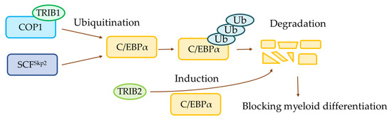 COP1 is a RING finger containing protein and a Ub E3 ligase that acts as a tumor suppressor [59] and oncoprotein [60,61]. COP1 is associated with myeloid differentiation; it is a Ub E3 ligase of C/EBPα that promotes degradation of C/EBPα, and blocks granulocyte differentiation in 32D cells [62]. COP1 has four alternative splicing forms including the wild-type (full length), Δ4 (lacking four amino acids coded in exon 4), Δ20 (lacking 20 amino acids coded in exon 7), and Δ24 (lacking both exons 4 and 7) [63]. Among the four alternative splicing forms of COP1, only Δ4 is able to downregulate C/EBPα. Blocking of myeloid differentiation by COP1 is highly dependent on Tribbles pseudokinase 1 (TRIB1). The TRIB1 binds to COP1 to enhance its Ub E3 ligase activity for C/EBPα, thereby accelerating blocking of the myeloid differentiation of hematopoietic cells for tumorigenesis [62].