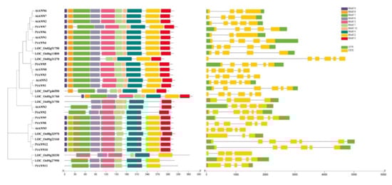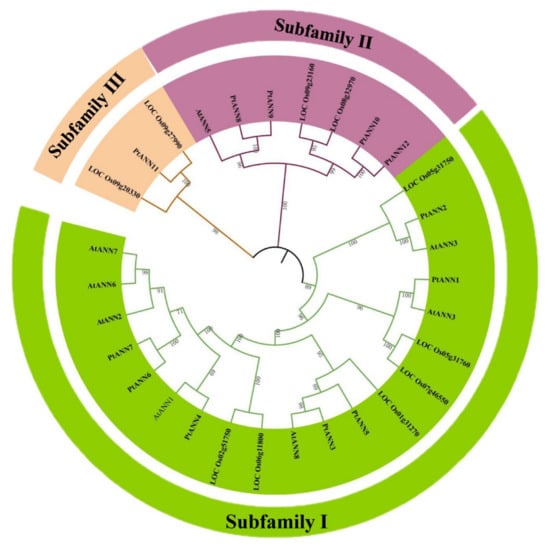 The whole genomes and annotations of P. trichocarpa, A. thaliana, and O. sativa were applied to downloaded from the phytochrome (https://phytozome-next.jgi.doe.gov/ (accessed on 2 August 2021)). The HMM model PF00191 of PtANN domain and 8 AtANN sequences were downloaded from TAIR (The Arabidopsis Information Resource) as a query to search the P. trichocarpa genome protein databases. The PtANNs achieved from the above methods were considered candidates and determined the completeness of the PtANN domain with SMART and the CDD database. In addition, the Cell-PLoc 2.0 (http://www.csbio.sjtu.edu.cn/bioinf/Cell-PLoc-2/ (accessed on 2 August 2021)) was used to identify the putative subcellular localization of PtANNs. The ExPASy (https://web.expasy.org/protparam/ (accessed on 2 August 2021)) was applied to calculate the molecular weights (MWs), theoretical isoelectric points (pI), and grand averages of hydropathicity (GRAVYs) of PtANNs.