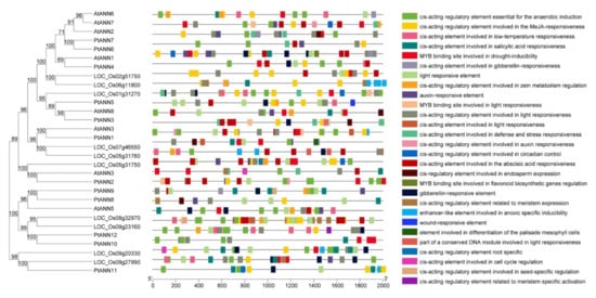 The predicted cis-elements in PtANN gene promoters. PlantCARE analyzed promoter sequences (−2000 bp) of poplar, Arabidopsis, and rice ANN genes. The different colored rectangles indicated divergent cis-elements, and the solid black lines implied PtANN promoters.