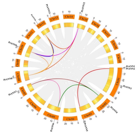Synteny analysis of PtANN genes. The orange rectangles indicated chromosomes 01–19. The yellow gradient lines in rectangles implied gene densities on chromosomes. Gray lines in the circle showed segmental duplication events in poplar, and colored lines indicated collinearity events of PtANN members.