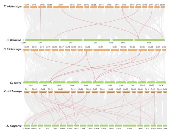 To further explore the evolutionary origin among PtANN, AtANN, OsANN, and SpANN members, a syntenic map of P. trichocarpa associated with A. thaliana, Salix purpurea, and O. sativa was constructed based on the syntenic orthologous gene pairs. According to MCScanX analysis, six syntenic orthologous gene pairs were identified between P. trichocarpa and A. thaliana, seven gene pairs between P. trichocarpa and O. sativa, and 23 gene pairs between P. trichocarpa and S. purpurea, implying that P. trichocarpa has different directions in evolution with A. thaliana, O. sativa and S. purpurea (Figure 5). Those results indicated that the poplar and willow had a closer relationship []. The inter-and intra-genomic collinearity analysis suggested that segmental duplication or whole-genome duplication of orthologous gene pairs occupied a significant proportion in the evolutionary process of the ANN gene family.
