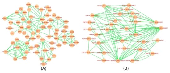 Interaction prediction can reveal the putative relationship among proteins. In general, the interacting proteins may play an essential role in plant growth and development and response to various stresses by comprehensive regulation. The String database (https://string-db.org/ (accessed on 22 August 2021)) was used to identify the possible interaction network, and the Cytoscape software was applied to visualize. As shown in Figure 6A, the interaction network of AtANN members was relatively complicated, and the putative proteins that interacted with AtANNs contained ubiquitin-associated (UBA)/TS-N domain-containing protein, cold shock domain protein, glutathione S-transferase, glycylpeptide N-tetradecanoyltransferase, calcineurin-like metallo-phosphoesterase, and so on. Additionally, the interaction relationship of PtANNs indicated that PtANNs might interact with glutathione S-transferase, glycylpeptide N-tetradecanoyltransferase, and so on (Figure 6B). The putative interaction relationship revealed that ANNs might regulate cellular ROS and the balance of intracellular and extracellular permeability.