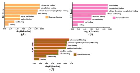 Regarding ANNs associated with ROS and osmotic homeostasis, gene ontology (GO) was applied to identify the putative physiological function of ANNs. Based on the GO analysis, the ANNs were significantly enriched in molecular function, such as calcium ion binding function, phospholipid-binding function, calcium-dependent phospholipid binding function, and lipid-binding function (Figure 7). It is suspected that ANNs may participate in osmotic stresses by regulating osmolytes, including lipid and ion. In addition, ANNs as the Ca2+-dependent proteins were supposed to be associated with the stress resistances through maintaining intracellular and extracellular Ca2+ homeostasis. These observations have shown that ANNs are essential proteins for cells to resist intracellular and extracellular homeostasis.