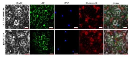 Based on the analysis of restriction sites of PtANN4 and pCAMBIA1302, the KpnI and XbaI were chosen to construct the subcellular plasmid. The gene-specific primers for constructing the recombinant vectors are shown in Supplementary Table S4. The coding region of PtANN4 was cloned into the pCAMBIA1302 vector to generate the recombinant vector pCAMBIA1302-PtANN4-GFP. The Agrobacterium GV3101 containing the recombinant vector pCAMBIA1302-PtANN4-GFP were cultivated, harvested, and resuspended in 10 mM MgCl2 solution containing 10 mM 4-morpholineethanesulfonic acid hydrate (MES). The resuspended Agrobacterium GV3101 suspensions were infiltrated into N. benthamiana leaves, and the GFP signals were detected by a C2-ER confocal laser fluorescence microscope (Nikon, Tokyo, Japan) after injection for 72 h.