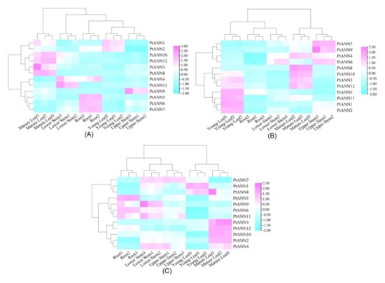 To explore the putative functions of PtANNs, qRT-PCR was used to examine the expression patterns of PtANN genes in different tissues of P. trichocarpa, ‘Nanlin 895’, and ‘Shanxinyang’. Generally speaking, the heatmap in Figure 9 showed that the 12 PtANN genes were expressed in the roots, stems, and leaves of poplar, and PtANN genes are presented at the dominant tissue-specific expression. (Figure 9A). Additionally, the highest expression levels PtANN4, 9, and 11 were identified in stems of P. trichocarpa. In contrast, the largest expression accumulations of PtANN5–7 were found in roots, and the highest mRNA accumulations of PtANN2 were detected in young leaves of P. trichocarpa. In addition, PtANN1, 3, 8, 10, and 12 were highly expressed in mature leaves of P. trichocarpa (Figure 9A). Cluster analysis showed that PtANN10 and PtANN12 were clustered on the same branch. In contrast, PtANN1–9 and PtANN11 were clustered on another branch, implying that PtANNs clustered on the same branch had relatively similar expression patterns. The expression patterns of the PtANN genes were also discovered in the leaves, stems, and roots of ‘Nanlin 895’ (Figure 9B). For example, PtANN6, 7, and 9 had relatively higher expression levels in stems. In comparison, other PtANNs presented higher expression levels in leaves, and the lower expression levels of all PtANNs were detected in roots. For ‘Shanxinyang’, the PtANNs expression shared the divergent features in different organs and tissues (Figure 9C). For example, higher transcriptional levels of PtANN5 and 6 were presented at roots. PtANN1–3, 8, 10, and 12 exhibited higher expression levels in mature leaves. In addition, higher expression levels of PtANN4, 7, 9, and 11 were accumulated in the stems. Taken together, PtANNs are widely expressed in various tissues, indicating that PtANNs may be extensively involved in several types of physiological activities of poplar. In addition, the expression pattern of the same PtANN gene in different poplar varieties occupied the divergent feature, indicating that the same PtANN may participate in various physiological processes and performs other functions in different poplar varieties.