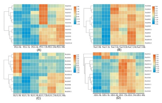 The qRT-PCR identification of PtANN expression levels in response to various stresses. The heatmap was used to show PtANN gene transcript levels under 10% PEG6000 (A), 200 mM NaCl (B), 2 mM H2O2 (C), and 200 μM ABA (D). Three independent experiments were repeated, and poplar PtActin (XM-006370951) was used as an internal control. PtANN expression was normalized to that in the untreated leaf.