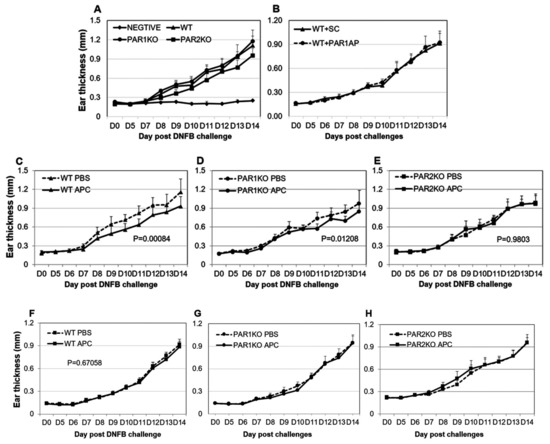 To investigate the effect of APC and PAR1/PAR2 on AD, a subchronic DNFB-induced CHS model was used to better reflect the chronic pathology of AD and to allow the therapeutic treatment of pre-established skin inflammation [26]. Clinical signs of CHS, including ear swelling, erythema and skin lesions rapidly developed after a four-day ear skin DNFB application in all mice. As expected, PAR2KO mice displayed an approximate 20% reduction (p = 0.0004) in ear thickness at day 14 when compared to WT mice, whereas no significant difference was found between PAR1KO and WT mice (Figure 1A). This suggests that PAR2 but not PAR1 is required for CHS development. This data was further confirmed by PAR1 agonist therapeutical administration, which showed that activation of PAR1 also did not affect DNFB-induced CHS (Figure 1B, data shown from 10 mg/kg).