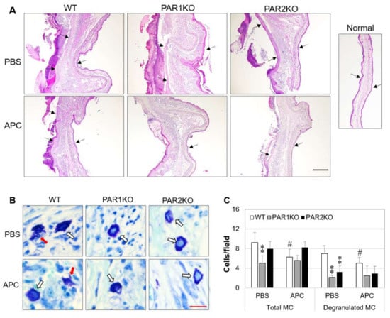 Mast cells (MCs) are principal effector cells in allergic diseases, including AD [27]. At day 14 after DNFB challenge, higher numbers of total/degranulated MCs were observed in all mice. However, when compared to WT mice, PAR1KO mice had significant lower numbers of both total and degranulated MCs, and PAR2KO mice also displayed lower number of degranulated MCs in the ear skin (Figure 2B). APC therapy inhibited MC infiltration and degranulation in WT, but not in PAR1KO or PAR2KO mice (Figure 2B,C), suggesting that the function of APC on MCs requires PAR1 or PAR2.