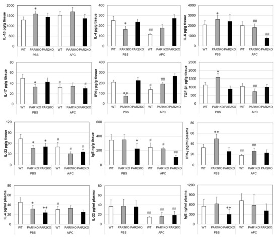 IgE induced by various allergens can mediate the development of AD through activation of MCs and dendritic cells localized in the skin [27]. In this study, IgE was increased in both serum and ear skin tissue from mice with CHS. However, PAR2KO mice had 35% lower tissue and 45% lower plasma IgE when compared to WT and PAR1KO mice (Figure 3), which corresponds to its lower disease activity. APC therapy significantly reduced IgE levels in tissues, but not in plasma from all three mouse strains.