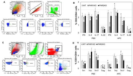 APC and PAR1 or PAR2 deficiency have been shown to affect Th cell phenotypes in a mouse model of human rheumatoid arthritis [14,28]. In this study, the effect of APC and the deficiency of PAR1 or PAR2 on the specific intracellular Th cytokines and Th cell phenotypes were examined using spleen cells isolated from mice with CHS. The gating strategies were shown in Figure 4A,C. In control cells, compared to WT, percentages of IFN-γ (Th1), IL-4 (Th2), IL-17 (Th17) or IL-22 (Th22) associated CD3 + CD4+ T cells were lower in PAR1KO cells; in contrast, only a lower level of IL-22-associated CD3 + CD4+ T cells was observed in PAR2KO cells (Figure 4B). APC increased the percentages of IL-4, while decreased the percentages of IL-17 and IL-22 associated CD3 + CD4+ T cells in all three types of spleen cells. Additionally, APC decreased IFN-γ associated CD3 + CD4+ T cells in PAR1KO spleen cells. Th1/Th2/Th17 and Treg cells phenotypes identified by their nuclear factors in combination with cell surface markers were also investigated. CD3 + CD4+ T cells from PAR1KO spleen cells contained lower proportions of Th1/Th2/Th17/Treg cells, while PAR2KO spleen cells consisted of lower Th1/Th17/Treg cells, when compared to WT (Figure 4D). APC decreased Th1 and Th17 cells in WT cells, had no effect in PAR1KO cells, and decreased Th1 and Th2 cells in PAR2 KO cells (Figure 4D). These data indicate that APC may require PAR1 to exert its function on Th1/Th17/Treg cells.