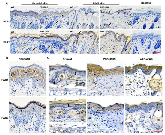 PAR1 and PAR2 expression in skin epidermis. PAR1 and PAR2 in the skin tissues were detected by immunostaining. (A) Representative images of PAR1 and PAR2 in skin tissues from newborn or adult WT, PAR1KO or PAR2KO mice. Scale bar: 100 µm. (B,C) Representative images of PAR1 and PAR2 in human neonatal foreskin (B), or in the ear skin from normal WT mice or WT mice with CHS treated with APC (2 mg/mL, APC + CHS) or PBS (PBS + CHS). Scale bar: 50 µm. CA: cartilage; EP: epidermis; DM: dermis; HF: hair follicle. Arrows indicate positive staining.