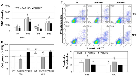 The barrier function of mouse keratinocytes was measured via the flux of FITC-dextran permeating from the apical to the basal side of keratinocyte monolayers. Under basal condition, compared to WT, FITC intensity was significantly higher in PAR1KO, and lower in PAR2KO cell monolayers at 1 and 3 h, respectively (Figure 6A). APC (1 µg/mL) reduced the FITC intensity of WT and PAR1KO, but not PAR2KO cell monolayers. In culture, PAR2KO keratinocytes grew significantly faster (~36%, p < 0.01), and PAR1KO cells much slower (~25%, p < 0.05), when compared to WT cells (Figure 6B). APC (1 µg/mL) increased WT and PAR1KO cell growth (~25%) but had no effect on PAR2KO cells (Figure 6B). When keratinocytes were cultured in chelex treated fetal bovine serum (chFBS)-reduced (1%) medium and detected by Annexin V and propidium iodide (PI) double staining and flow cytometry, PAR1KO resulted in a 37% increase (p < 0.05), while PAR2KO had a ~21% decrease (p < 0.05) in dead (apoptotic plus necrotic) cells compared to WT cells. APC reduced the number of WT and PAR1KO dead cells by ~20% (each p < 0.05) but did not affect PAR2KO cells (Figure 6C).