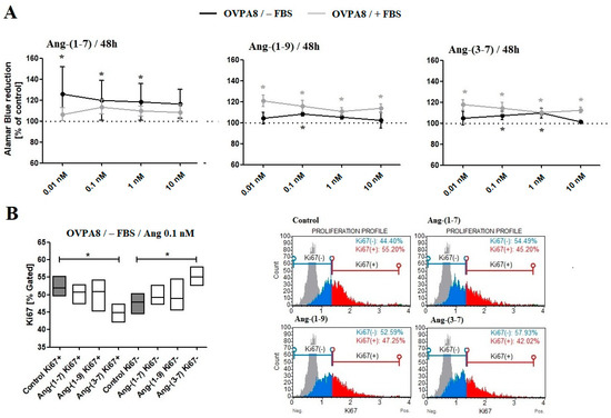 (A) The Alamar Blue Assay results, following the incubation (48 h) of ovarian cancer cells with tested angiotensins in the medium with or without FBS. (B) The Muse® Ki67 Proliferation Assay results following the incubation (48 h) of ovarian cancer cells with 0.1 nM angiotensins in the medium without FBS (mean ± SD; one-way ANOVA with Tukey’s test: * p < 0.05).